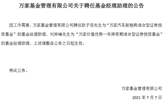 今日,万家基金管理有限公司发布《关于聘任基金经理助理的公告》,公告显示,因工作需要,万家基金管理有限公司聘任欧子辰为“万家汽车新趋势混合型证券投资基金”的基金经理助理、刘林峰为“万家价值优势一年持有期混合型证券投资基金”的基金经理助理。