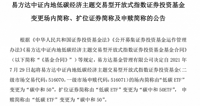 图:易方达低碳ETF公告改名为碳中和50 来源:公司公告