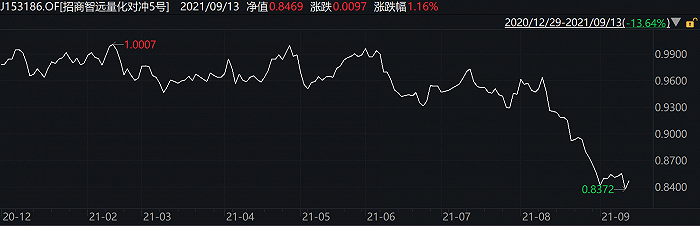 9月10日,招商资管旗下量化产品“招商智远量化对冲5号”单位净值创成立以来历史新低,仅为0.8372元,9月13日才小幅回升至0.8469元。