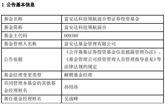 (原标题:吴战峰离任富安达科技领航混合 孙绍冰独立管理)