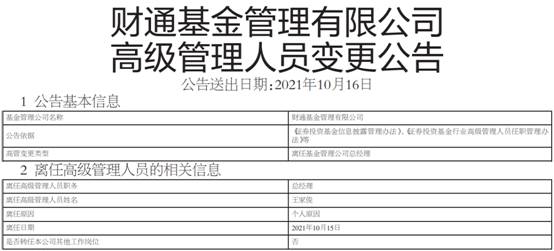 中国经济网记者还注意到,财通基金于上周末发布高级管理人员变更公告,总经理王家俊因个人原因离任,正式离任日期为10月15日。