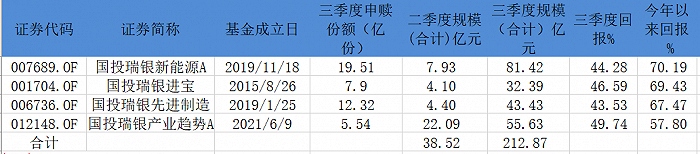业绩遥遥领先,随之而来的是几只基金规模的暴涨。二季度,四只基金规模合计为38.52亿元,而到了三季度末,四只基金规模则暴涨至212.87亿元,增加了174.35亿元。