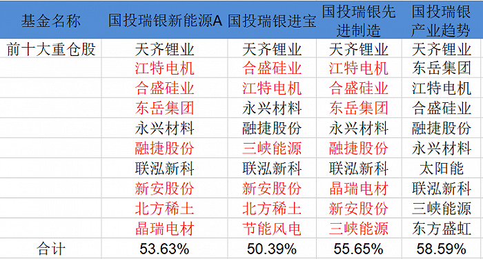 从持仓行业来看, 光伏、锂电、 半导体、有色、化工等个股均是基金经理看好的方向。具体到持仓来看,四只基金的前十大重仓股重合度很高,显示了基金经理的“无差别管理”。