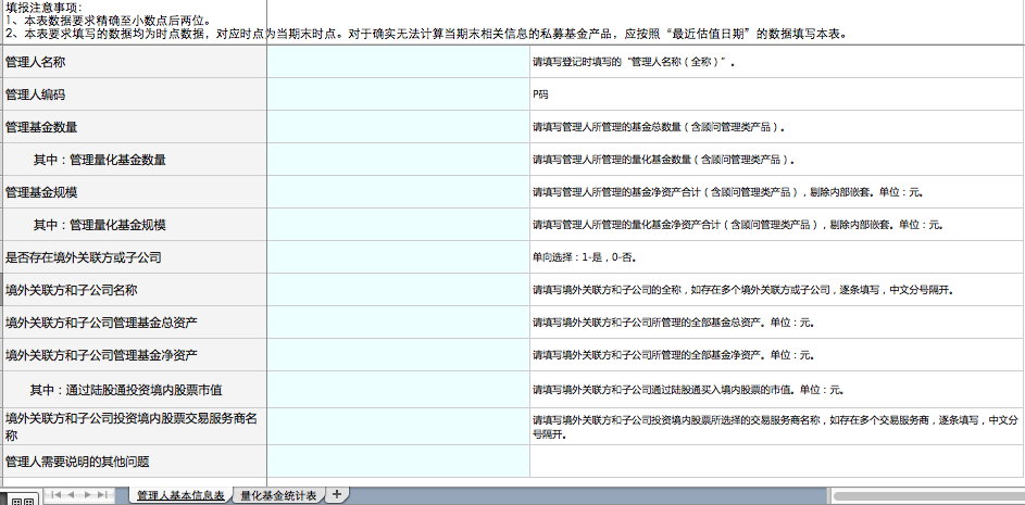 具体来看,量化管理人监测报表共分为2个,一是管理人基本信息表,包括管理人名称、编码、管理基金数量及规模、管理量化基金数量及规模、境外关联方或子公司情况等。二是量化基金统计表,包括基金名称、编码、中登公司一码通账户、期货保证金监控中心账户、量化主策略及辅策略、基金规模/总资产、净值、回撤、日均股票投资情况、期货及衍生品交易、融资融券、巨额赎回等。