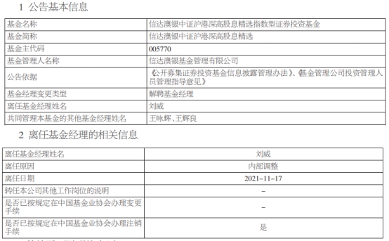 今日,信达澳银基金管理有限公司发布基金经理变更公告,刘威因内部调整离任信达澳银中证沪港深高股息精选(005770),该基金由王咏辉、王辉良共同管理。