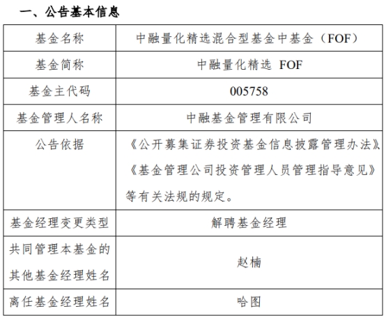 今日,中融基金管理有限公司发布基金经理变更公告,哈图因工作安排离任中融量化精选FOF(A类005758;C类005759),该基金由赵楠管理。