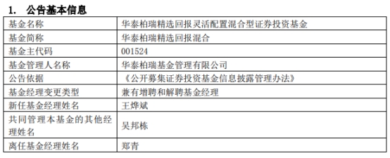 今日,华泰柏瑞基金管理有限公司发布基金经理变更公告,华泰柏瑞精选回报混合(001524)增聘基金经理王烨斌,与吴邦栋共同管理该基金,原基金经理郑青离任。