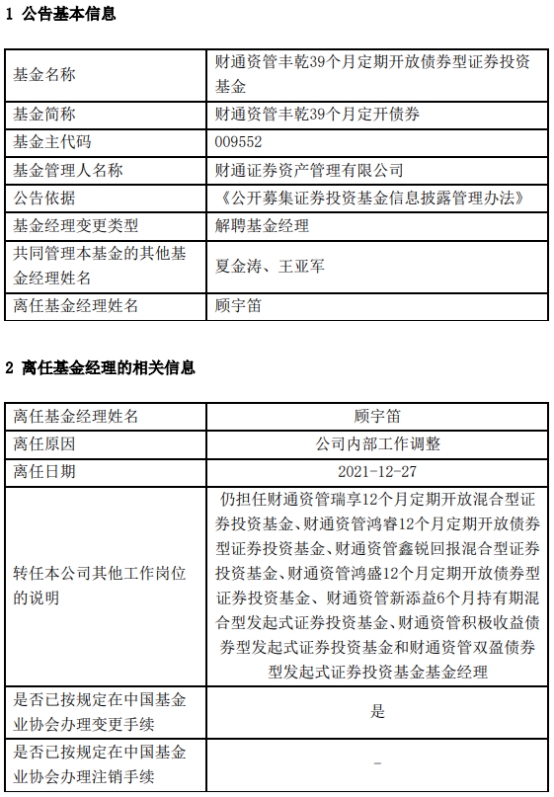 (原标题:顾宇笛离任财通资管丰乾39个月定开债券)