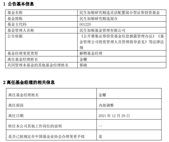 (原标题:金耀离任民生加银研究精选混合 蔡晓独立管理)