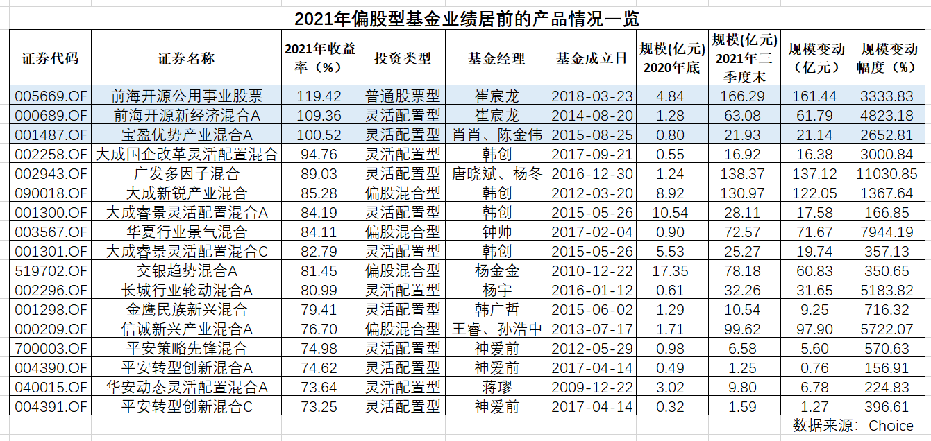 具体来看,崔宸龙一人包揽了年度冠、亚军,分别是所管理的前海开源公用事业股票、前海开源新经济混合A,年度净值涨幅分别达到119.42%、109.36%;贴身肉搏之后,在2021年最后一个交易日,肖肖和陈金伟管理的宝盈优势产业混合A年度回报率为100.52%,成为第三只年度“翻倍基”;韩创管理的大成国企改革灵活配置混合年度收益率为94.76%,合计4只产品年度涨幅超过90%。