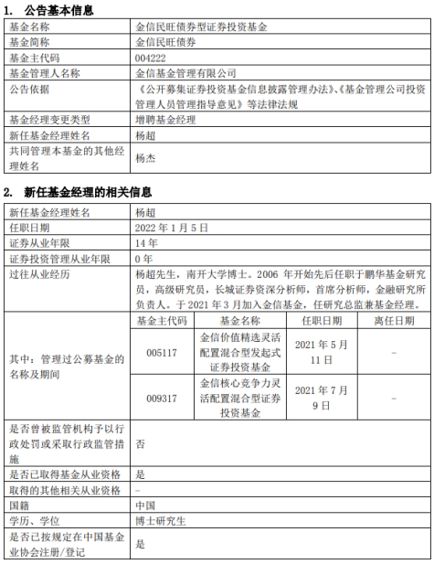 近日,金信基金管理有限公司发布基金经理变更公告,金信民旺债券(A类004222;C类004402)增聘基金经理杨超,与杨杰共同管理该基金。