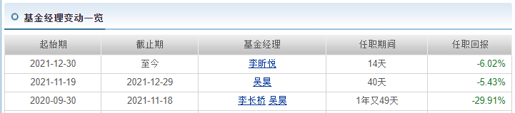 此外,方正富邦创新动力混合A、C在去年四季度还曾两度变更基金经理。自2020年9月30日起,李长桥、吴昊携手管理该基金,而在去年11月李长桥离任,两人共同管理该基金期间的任职回报为-29.91%。吴昊在独立管理该基金40天后,也于去年12月底离任,独管期间任职回报-5.43%。此后至今,该基金由李昕悦管理,上任14天任职回报-6.02%。
