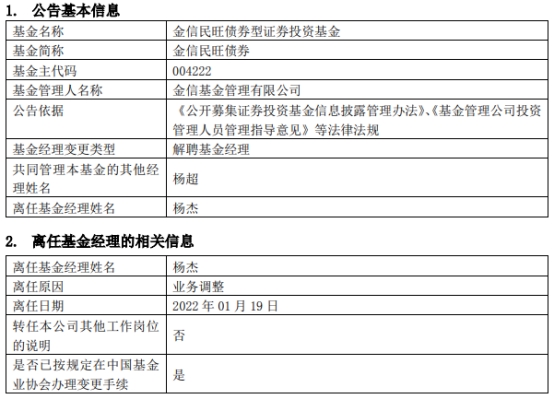 近日,金信基金管理有限公司发布基金经理变更公告,杨杰因业务调整离任金信民旺债券(A类004222;C类004402),该基金由杨超独立管理。