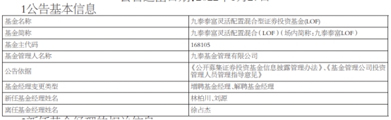 今日,九泰基金管理有限公司发布基金经理变更公告,九泰泰富灵活配置混合(LOF)(场内简称:九泰泰富LOF)(168105)增聘基金经理林柏川、刘源,原基金经理徐占杰因个人原因离任。