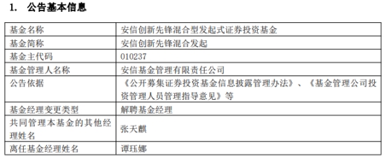 (原标题:安信基金谭珏娜离任2只混基 安信创新先锋开年跌19%)