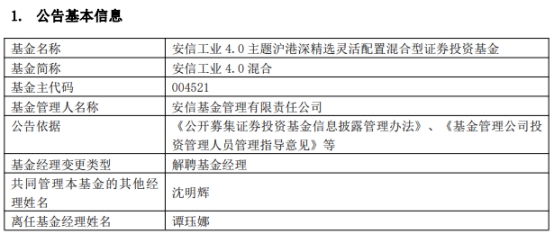 今日,安信基金管理有限责任公司发布基金经理变更公告,谭珏娜因工作需要离任安信工业4.0混合(A类004521;C类004522)、安信创新先锋混合(A类010237;C类010238),安信工业4.0混合由沈明辉独立管理,安信创新先锋混合由张天麒独立管理。