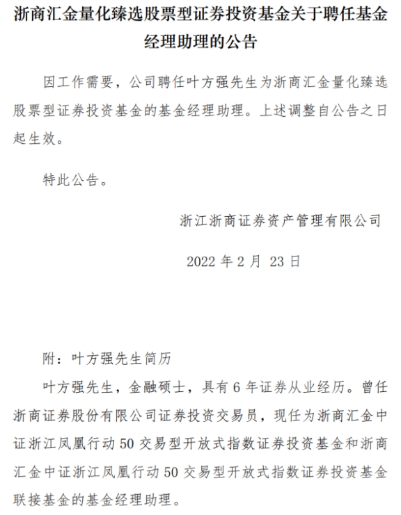 (原标题:浙商汇金量化臻选聘任基金经理助理叶方强 年内亏5%)