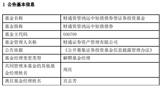 近日,财通证券资产管理有限公司发布基金经理变更公告,宫志芳因公司内部工作调整离任财通资管鑫盛6个月定开混合、财通资管鸿运中短债债券、财通资管鸿达债券。