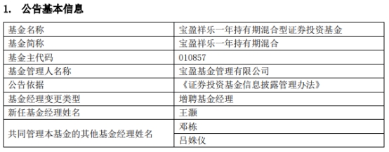 今日,宝盈基金管理有限公司发布基金经理变更公告,宝盈祥乐一年持有期混合(A类010857;C类010858)、宝盈祥利稳健配置混合(A类008324;C类008325)增聘基金经理王灏。