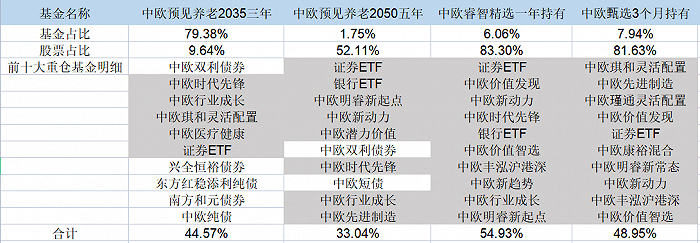 以中欧甄选3个月为例,前十大重仓的产品中,除了国泰证券ETF外,其余9只产品均是中欧基金旗下的主动权益类产品,如中欧琪和、中欧现金制造、中欧价值发现、中欧明睿新常态等。