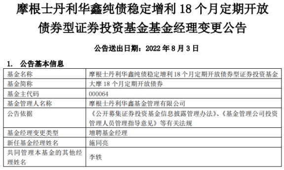 今日,摩根士丹利华鑫基金管理有限公司发布基金经理变更公告,大摩18个月定期开放债券(000064)、大摩民丰盈和一年持有期混合(010222)增聘基金经理施同亮,与李轶共同管理。