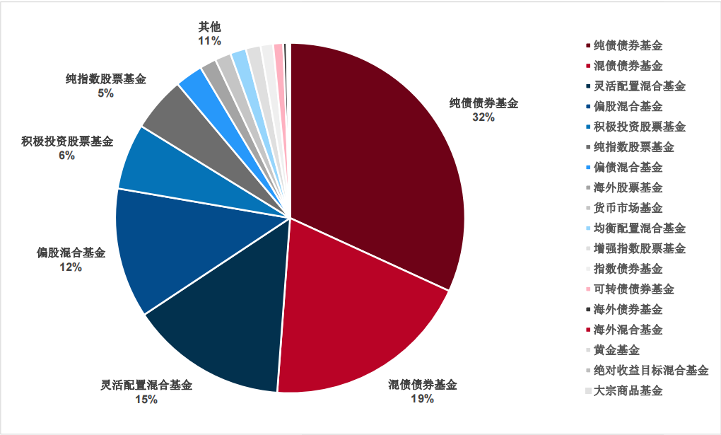 注:蓝色系为主动股混基金,红色系为主动债券基金,其余基金类型为灰色系