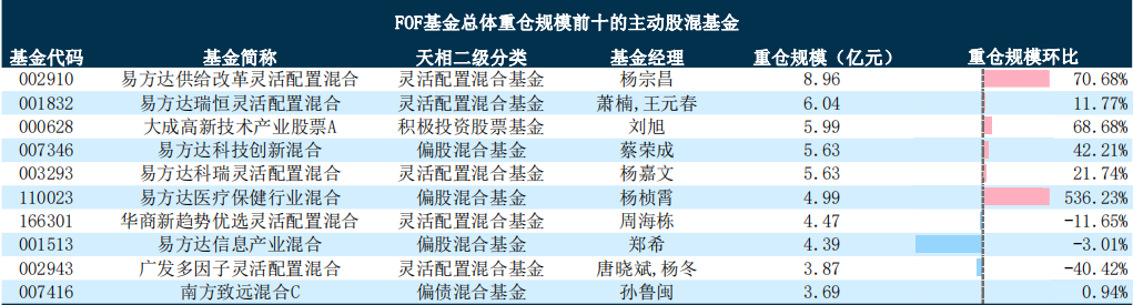 FOF基金总体重仓规模前十的主动股混基金,数据来源:天相投顾,截至2023年二季度末