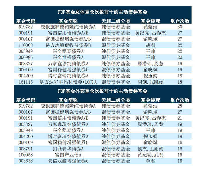 主动债券基金中,交银施罗德裕隆纯债债券A被FOF基金总体重仓次数最高,为30次;其次为富国信用债券A/B和富国稳健增强债券A/B,被FOF基金总体重仓均为27次。外部重仓数据方面,交银施罗德裕隆纯债债券A被FOF基金外部重仓次数依然最高,为28次;其次为富国稳健增强债券A/B,被FOF基金外部重仓27次。