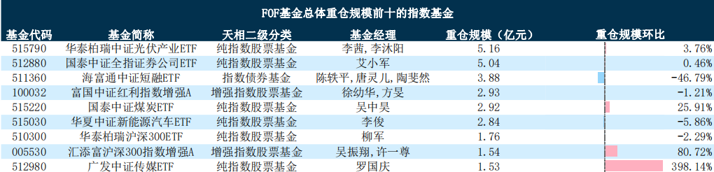 指数基金方面,截至二季度,中海富通中证短融ETF被FOF基金总体重仓次数最高,为36次;其次为华泰柏瑞中证光伏产业ETF,被FOF基金总体重仓18次。