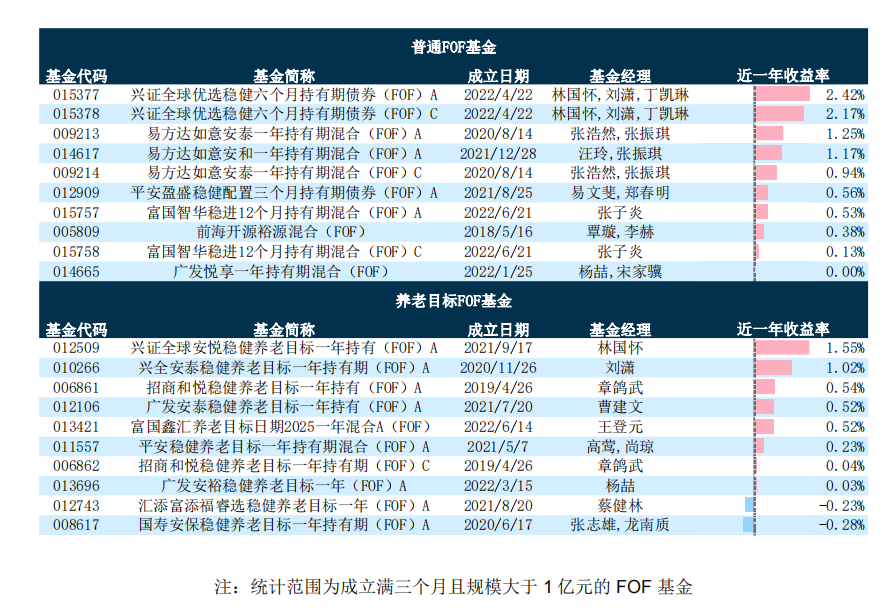 其中,表现最好的普通FOF基金为兴证全球优选稳健六个月持有期债券(FOF)A,该基金近一年收益率为2.42%;表现最好的养老目标FOF基金为兴证全球安悦稳健养老目标一年持有(FOF)A,该基金近一年收益率为1.55%。