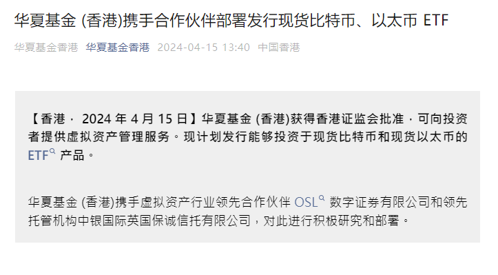 4月15日,华夏基金(香港)、博时国际、嘉实国际等三家基金公司子公司均宣布,计划发行能投资于现货比特币和现货以太币的ETF产品。这距离上周二获得虚拟资产资管服务资格仅一周时间。