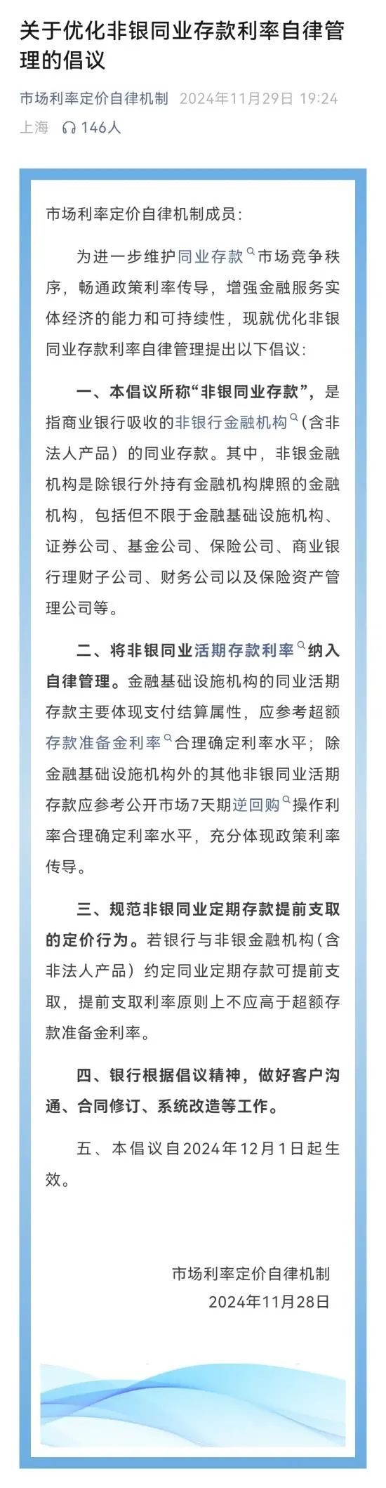 近日,市场利率定价自律机制秘书办发布《关于优化非银同业存款利率自律管理的倡议》(以下简称《倡议》),将非银同业活期存款利率纳入自律管理,同时规范非银同业定期存款提前支取的定价行为。