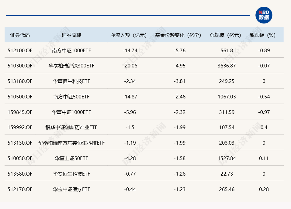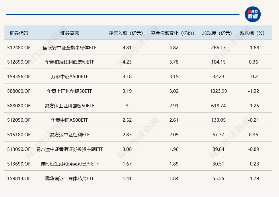 与此同时,南方中证1000ETF基金份额减少5.76亿份,净流出额为14.74亿元;华泰柏瑞沪深300ETF基金份额减少4.95亿份,净流出额为20.06亿元;华夏恒生科技ETF基金份额减少3.81亿份,净流出额为2.34亿元。