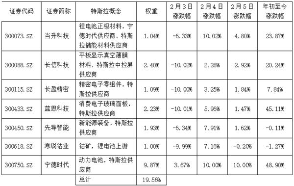 创业板50指数含生物医药行业股票8只,合计占指数权重28.4%;特斯拉概念股7只,合计占指数权重19.56%,其中宁德时代是该指数的第一大权重股,占比9.87%;网游概念股3只,合计占指数权重3.65%。特斯拉概念股中的宁德时代是该指数的第一大权重股,占比近10%。