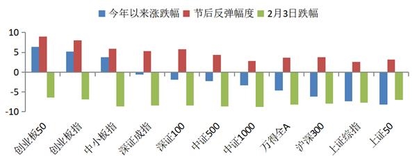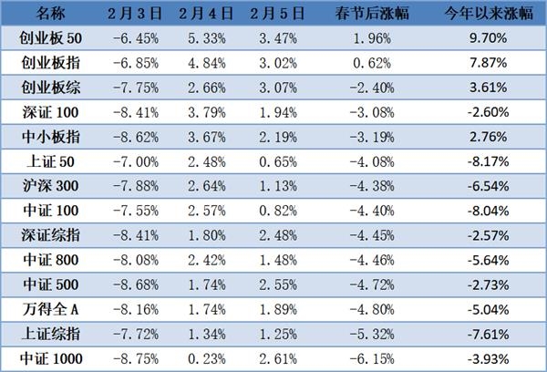 由于继春节后首个交易日大跌之后,此后两个交易日A股市场都迎来的反弹。从市场主流宽基指数的整体表现来看,按照市场表现从好到差依次是创业板、沪深大盘、全市场综合、沪深中小盘。其中创业板50指数在所有的宽基指数中,首日下跌最少,反弹的力度最大,因此不管是春节后还是2020年以来,都是表现最好的宽基指数之一。