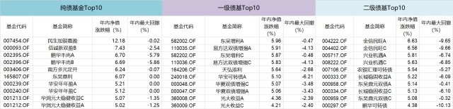 各位小伙伴可以看下年内这3类债基Top10的涨跌和回撤情况来直观感受下: