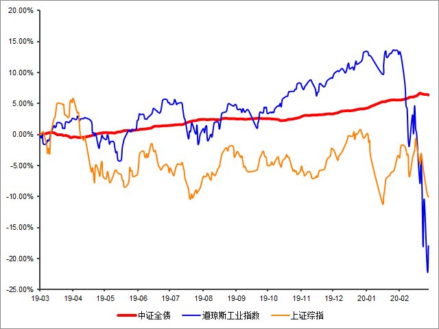 由于债券基金要求不低于80%的资金投资于债券等固收产品,同债市联系最为密切,我们可以看下截至3月17日,近一年债市、A股和美股的涨跌情况。