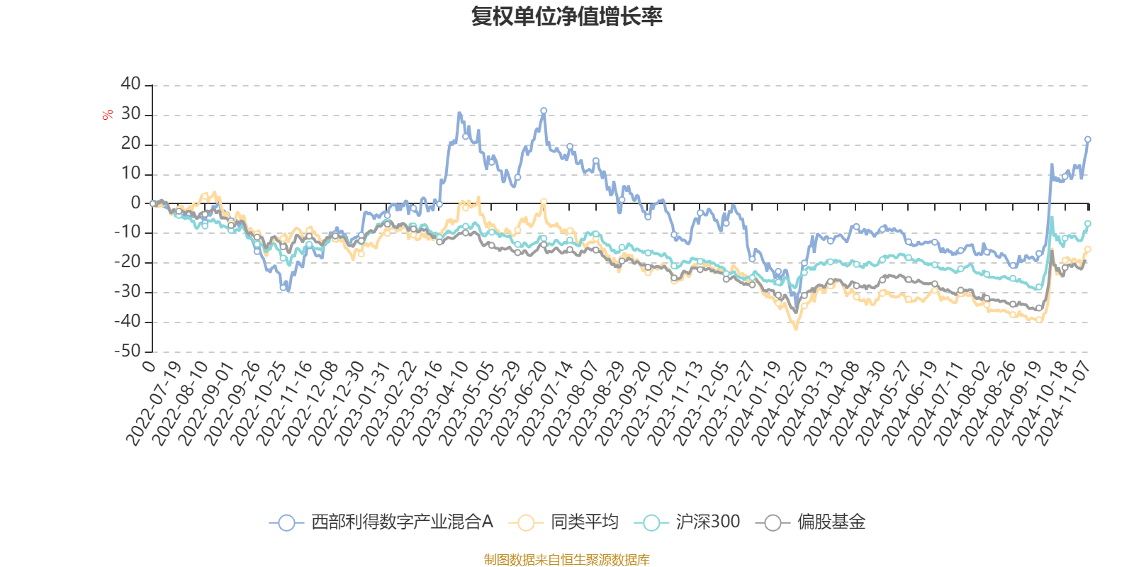 截至11月7日,西部利得数字产业混合A近三个月复权单位净值增长率为44.85%,位于同类可比基金21/202;近半年复权单位净值增长率为31.49%,位于同类可比基金29/202;近一年复权单位净值增长率为30.39%,位于同类可比基金14/182。