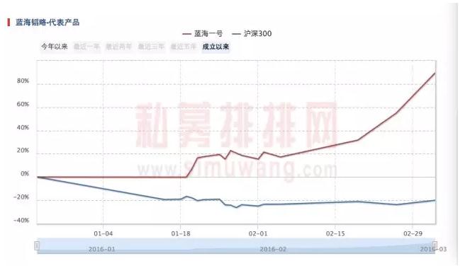 数据显示,今年1~2月份,股票策略私募产品的第一名被北京的一家叫“蓝海韬略资本”的黑马私募一举拿下,旗下“蓝海一号”,截至2月26日收益率高达55.1%,超出第二名“大地期货-永乐春”将近27个百分点,而今年以来由于受股灾影响,股票策略私募产品平均收益率是-13.2%。