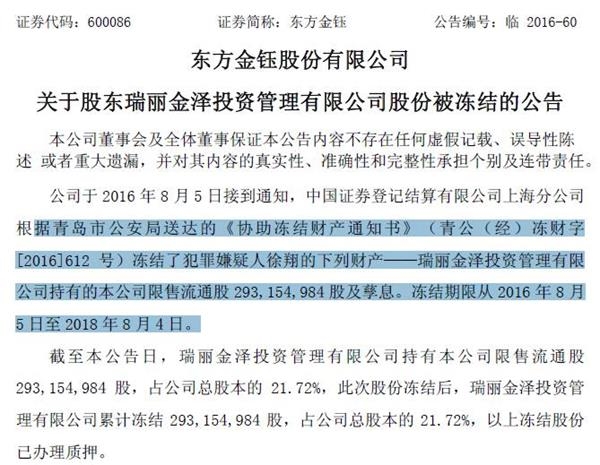 在8月5日,东方金钰公告,青岛市公安局冻结了犯罪嫌疑人徐翔的财产——瑞丽金泽投资管理有限公司所持有的该公司限售流通股,共2.93亿股,冻结两年。截至公告日,瑞丽金泽持有东方金钰限售流通股29315.49万股,占公司总股本的21.72%。