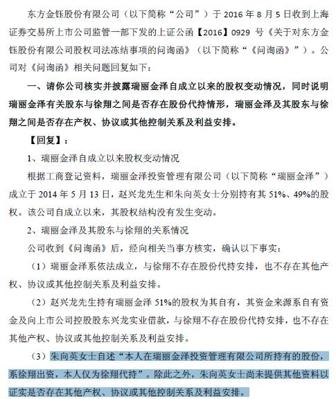 回顾此次整个事件过程,在8月5日,上交所向东方金钰发出问询函,要求于8月10日前说明瑞丽金泽有关股东与徐翔之间是否存在股份代持情形,其股东与徐翔之间是否存在产权、协议或其他控制关系及利益安排。