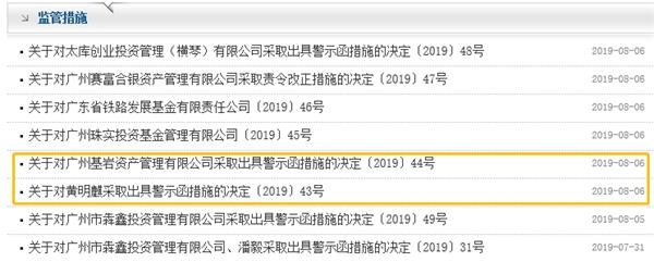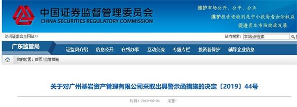 8月2日,广东证监局连发两则公告,对广州基岩资产管理有限公司和其高管黄明麒,均采取出具警示函的行政监管措施。