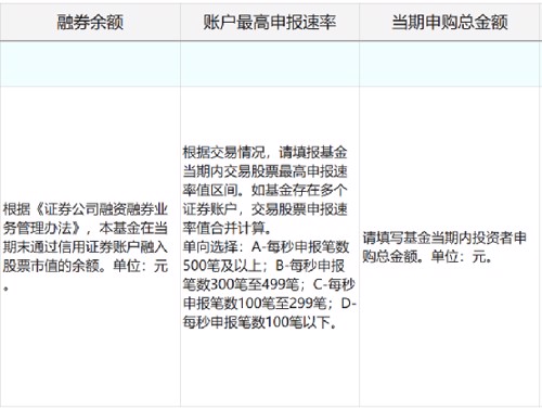 此外,表格还要求填写账户最高申报速率。根据交易情况,请填报基金当期内交易股票最高申报速率值区间。如基金存在多个证券账户,交易股票申报速率值合并计算。