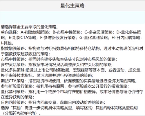 量化主策略是指基金主要采取的量化策略,具体可以看下面的表格的内容。同时协会还表示,指混合策略基金中,除主策略之外的其他策略。若基金仅采取单一策略,无需填报。