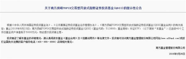 8月26日,南方东证指数ETF发出“已连续40个工作日基金资产净值低于5000万元,特此提示投资者注意”的提示公告。