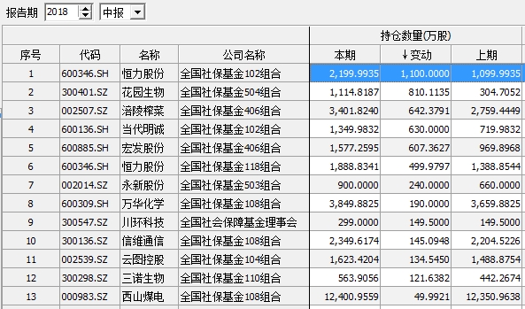 从加仓情况来看。今年上半年,社保基金累计加仓恒力股份1599.98万股,成为加仓股数最多的公司;花园生物和涪陵榨菜,则以810.11万股和642.38万股的加仓股数,位列其后。