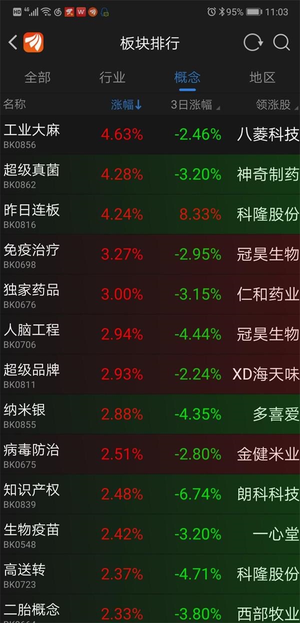 从板块来看,工业大麻、超级真菌等题材股领涨两市,白色家电、化学制药等也都出现了较大涨幅: