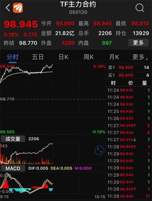 TF主力合约也同样上涨。TF主力合约今早开盘后也迅速上涨,短时间内迅速将涨幅扩大至0.17%,截至上午收盘,TF主力合约上涨0.18%,达98.945元。