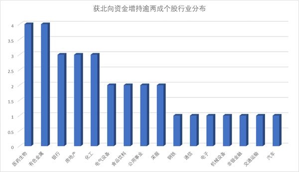 分行业来看,医药生物、有色金属行业获北向资金大比例增持的个股较多,均有4只在列;银行、房地产、化工行业均有3只。计算机、传媒、农林牧渔等行业并未有个股上榜。