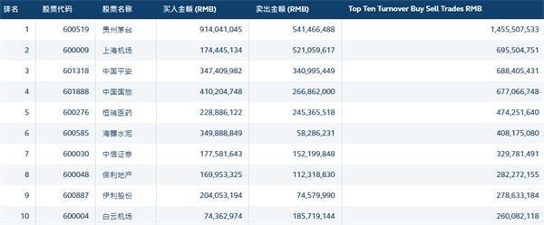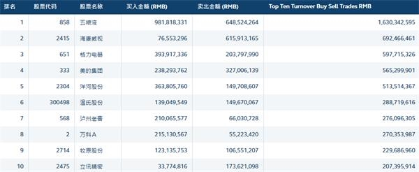 盘后交易数据显示,贵州茅台、五粮液均获净买入逾3亿元,海康威视遭净卖出5.39亿元,上海机场被卖出3.47亿元。